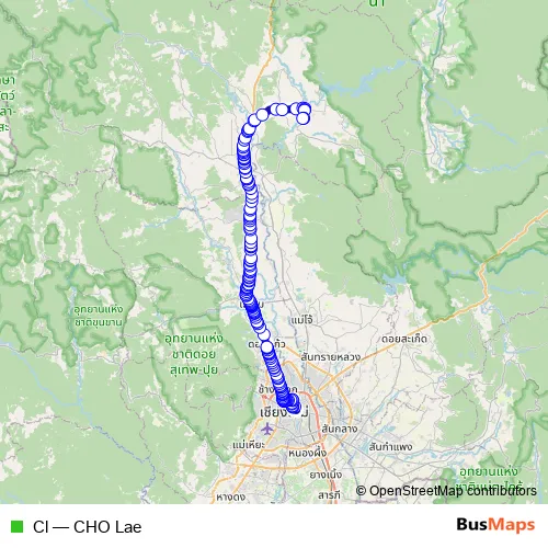 The first stop of the Cl bus route is ฝั่งตรงข้ามตลาดเทศบาลนครเชียงใหม่ Opposite Chiang Mai City Municipal Market and the last stop is วัดศรีภูมินทร์ Wat Si Phumin. Cl (CHO Lae) is operational during everyday.