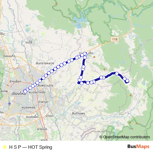 The first stop of the H S P bus route is น้ำพุร้อนสันกำแพง San Kam Phaeng Hot Spring and the last stop is คิวรถเขื่อนแม่กวง Khuean Mae Kuang Bus Station. H S P (HOT Spring) is operational during everyday.