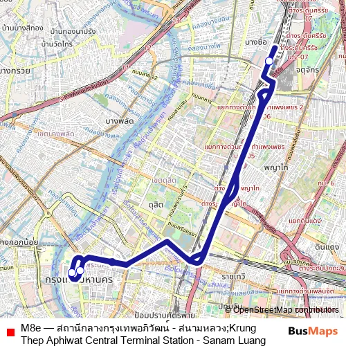 The first stop of the M8e bus route is ด้านหลังสถานีกลางกรุงเทพอภิวัฒน์;Rear Krung Thep Aphiwat Central Terminal and the last stop is ด้านหลังสถานีกลางกรุงเทพอภิวัฒน์ (shuttle) (จุดสิ้นสุด);Rear Krung Thep Aphiwat Central Terminal. M8e (สถานีกลางกรุงเทพอภิวัฒน์ - สนามหลวง;Krung Thep Aphiwat Central Terminal Station - Sanam Luang) is operational during everyday.
