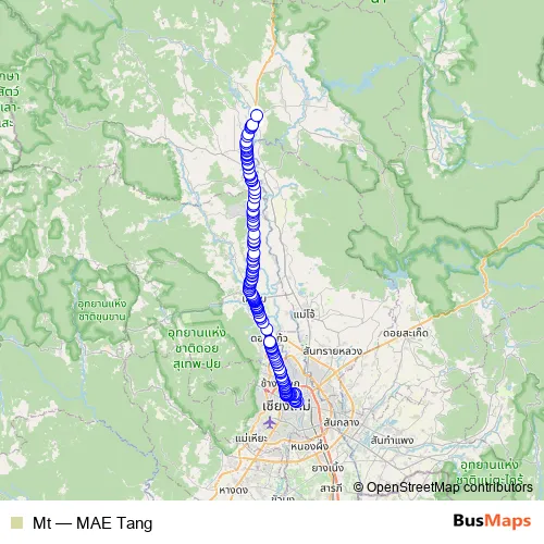 The first stop of the Mt bus route is ห้างทองโอ้วจินเฮง Ao Jin Heng Gold Shop and the last stop is ฝั่งตรงข้ามคิวรถแม่แตง Opposite Mae tang bus station. Mt (MAE Tang) is operational during everyday.