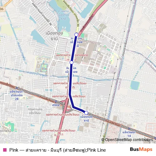 The first stop of the Pink metro route is MRT ทะเลสาบเมืองทองธานี;Mrt Lake Muang Thong Thani and the last stop is MRT สถานีเมืองทองธานี;Mrt Muang Thong Thani. Pink (สายแคราย - มีนบุรี (สายสีชมพู);Pink Line) is operational during everyday.