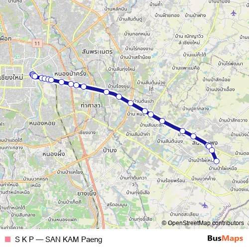 The first stop of the S K P bus route is คิวรถสันกำแพง Taxi Sankampaeng and the last stop is คิวรถเข้าเมือง Sankampaeng Bus Station. S K P (SAN KAM Paeng) is operational during everyday.