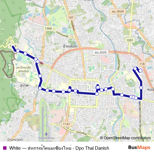 The first stop of the White bus route is สหกรณ์โคนมเชียงใหม่ Dpo Thai Danish and the last stop is สถานีขนส่ง Arcade. White (สหกรณ์โคนมเชียงใหม่ - Dpo Thai Danish) is operational during everyday.