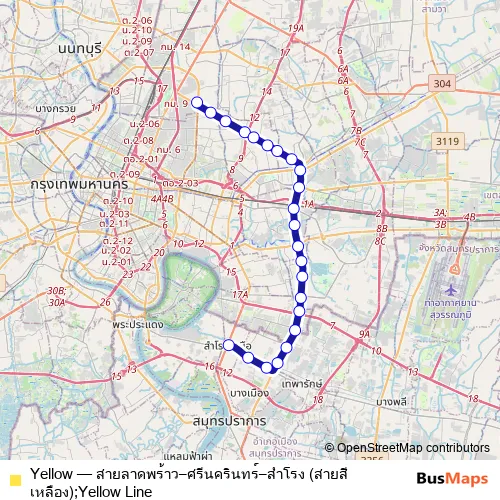 The first stop of the Yellow metro route is MRT ลาดพร้าว;Mrt Lad Phrao and the last stop is MRT สำโรง;Mrt Samrong. Yellow (สายลาดพร้าว–ศรีนครินทร์–สำโรง (สายสีเหลือง);Yellow Line) is operational during everyday.