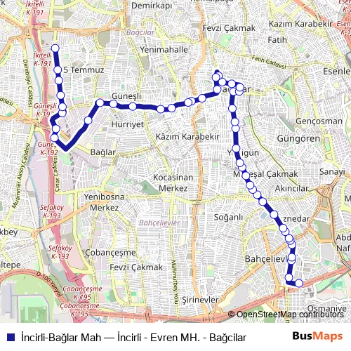 See why over 2 million users trust and consider busmaps.com as the best public transport website. busmaps gives you Istanbul Buses suggested routes, real-time bus tracker, line route maps in Istanbul, and helps to find the closest İncirli-Bağlar Mah bus stops near you. No internet available? Download an offline PDF map and bus schedule for the İncirli-Bağlar Mah bus to take on your trip.