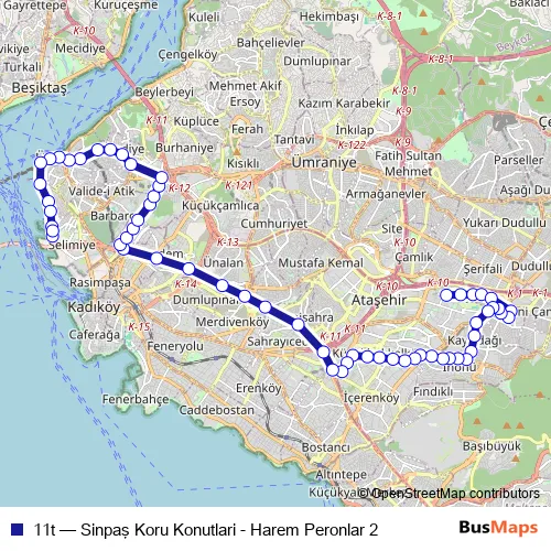 The first stop of the 11t bus route is Sinpaş Koru Konutlari and the last stop is Harem Peronlar 2. 11t (Sinpaş Koru Konutlari - Harem Peronlar 2) is operational during on weekdays.