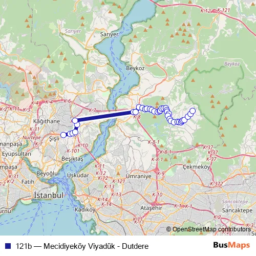 The first stop of the 121b bus route is Mecidiyeköy Viyadük and the last stop is Dutdere. 121b (Mecidiyeköy Viyadük - Dutdere) is operational during on weekdays.