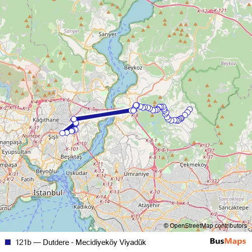 The first stop of the 121b bus route is Dutdere and the last stop is Kavacik Aktarma. 121b (Dutdere - Mecidiyeköy Viyadük) is operational during everyday.