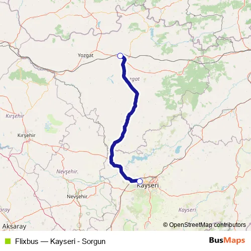 The first stop of the Flixbus bus route is Sorgun bus station and the last stop is Kayseri bus station. Flixbus (Kayseri - Sorgun) is operational during everyday.