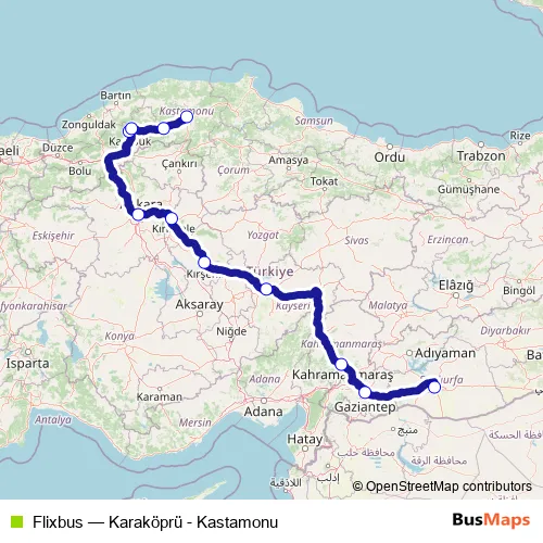 The first stop of the Flixbus bus route is Karaköprü Bus Terminal between Şanlıurfa and the last stop is Kastamonu Bus Station. Flixbus (Karaköprü - Kastamonu) is operational during on weekdays.