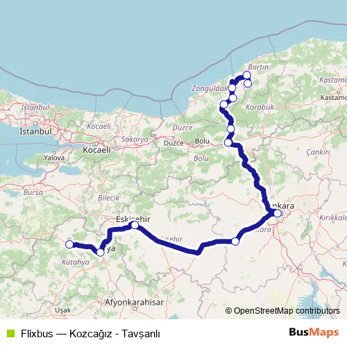 The first stop of the Flixbus bus route is Kozcağız Cumhuriyet Cd and the last stop is Tavşanlı Tavsanli Otagar. Flixbus (Kozcağız - Tavşanlı) is operational during everyday.