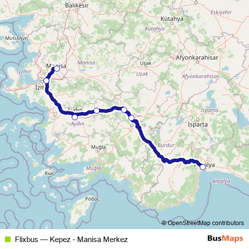 The first stop of the Flixbus bus route is Manisa Merkez Manisa metropolitan bus terminal and the last stop is Kepez Antalya Terminal District Download Peron. Flixbus (Kepez - Manisa Merkez) is operational during everyday.