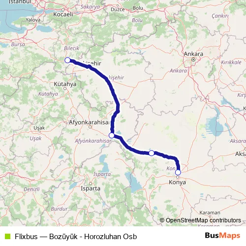 The first stop of the Flixbus bus route is Bozüyük Seramik Cd.No: and the last stop is
