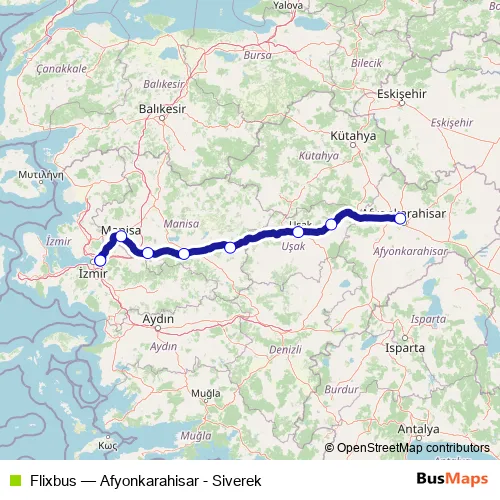 The first stop of the Flixbus bus route is Afyonkarahisar Bus Station and the last stop is