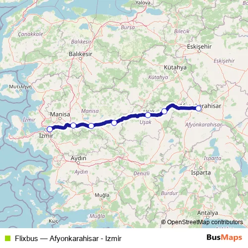 The first stop of the Flixbus bus route is Afyonkarahisar Bus Station and the last stop is