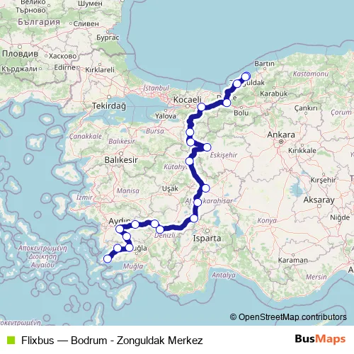 The first stop of the Flixbus bus route is Zonguldak Merkez Milli Egemenlik Caddesi and the last stop is Bodrum Torba Bus Station. Flixbus (Bodrum - Zonguldak Merkez) is operational during everyday.