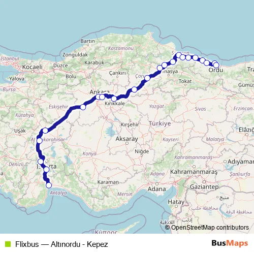 The first stop of the Flixbus bus route is Kepez Antalya Terminal District Download Peron and the last stop is Altınordu. Sokak. Flixbus (Altınordu - Kepez) is operational during everyday.