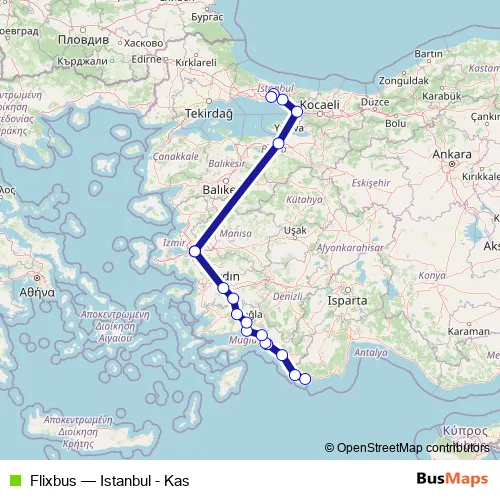The first stop of the Flixbus bus route is Kaş, Kaş bus station and the last stop is Istanbul, Istanbul Esenler. Flixbus (Istanbul - Kas) is operational during everyday.