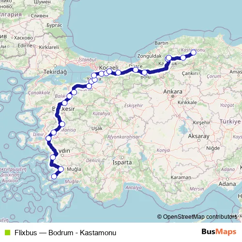 The first stop of the Flixbus bus route is Bodrum Torba Bus Station and the last stop is Kastamonu Bus Station. Flixbus (Bodrum - Kastamonu) is operational during everyday.