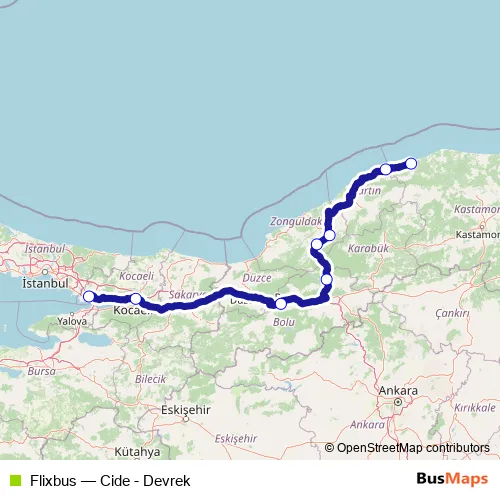 The first stop of the Flixbus bus route is Cide Otogaric and the last stop is