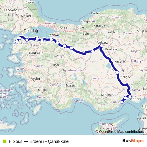 The first stop of the Flixbus bus route is Mersin bus station and the last stop is Canakkale Bus Station. Flixbus (Erdemli - Çanakkale) is operational during everyday.
