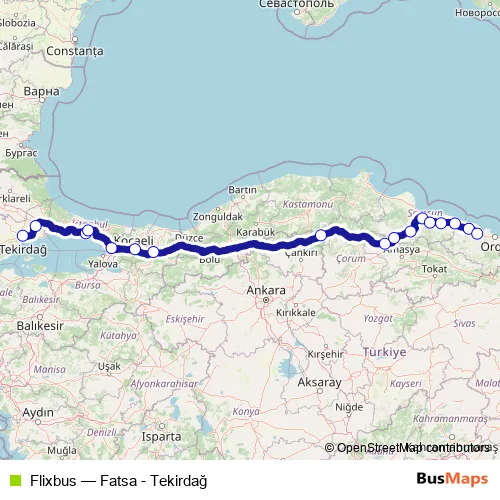 The first stop of the Flixbus bus route is Tekirdag Bus Station and the last stop is Fatsa Otogar. Flixbus (Fatsa - Tekirdağ) is operational during everyday.