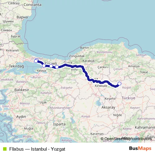 The first stop of the Flixbus bus route is Yozgat Bus Station and the last stop is Istanbul Central Bus Station. Flixbus (Istanbul - Yozgat) is operational during everyday.