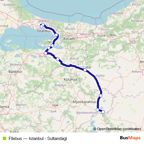 The first stop of the Flixbus bus route is Sultandagi Afyon Konya Yolu and the last stop is Istanbul Central Bus Station. Flixbus (Istanbul - Sultandagi) is operational during everyday.