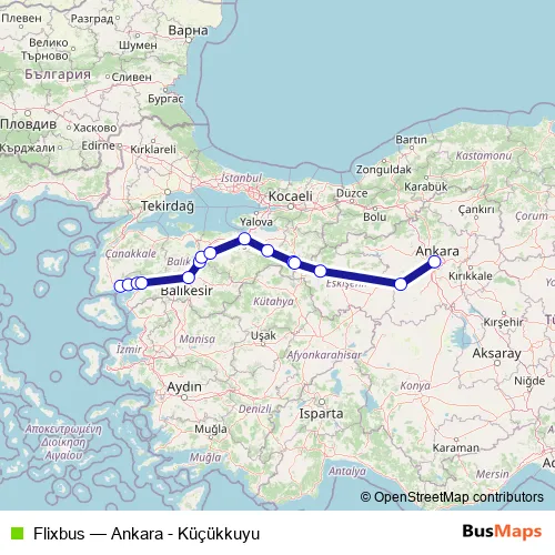 The first stop of the Flixbus bus route is Küçükkuyu, Küçükkuyu bus station and the last stop is Ankara, Ankara bus station. Flixbus (Ankara - Küçükkuyu) is operational during everyday.