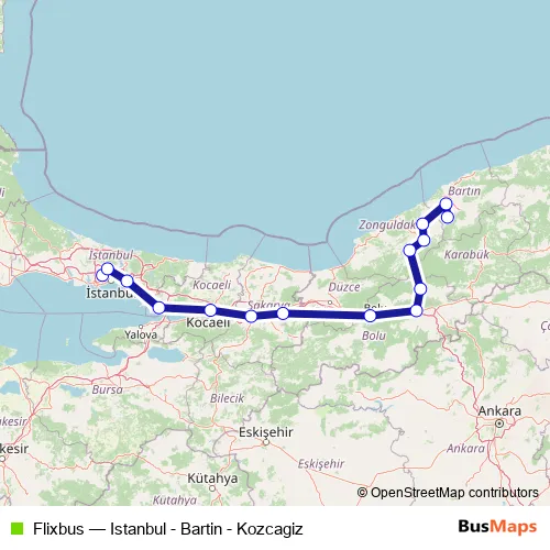 The first stop of the Flixbus bus route is Istanbul, Istanbul Esenler and the last stop is Kozcağız, Kozcağız bus station. Flixbus (Istanbul - Bartin - Kozcagiz) is operational during everyday.