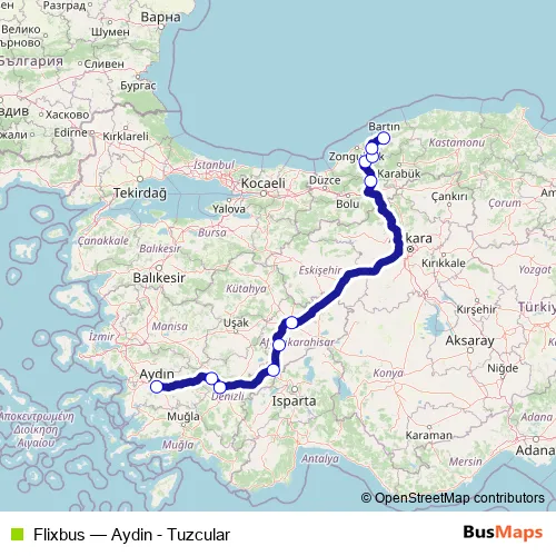 The first stop of the Flixbus bus route is Aydın Sehirlerarası Bus Station and the last stop is