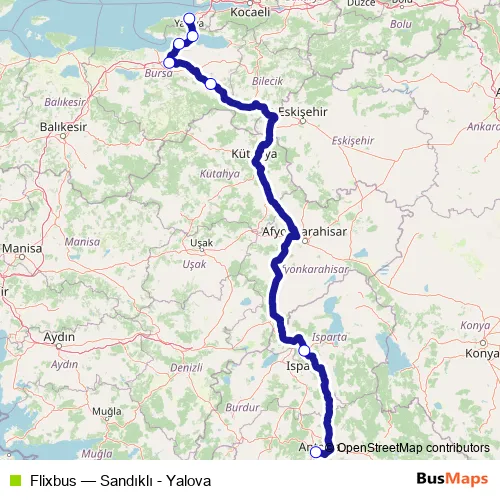 Services on the Flixbus - Sandıklı - Yalova bus start at 21:45 on Monday, Tuesday, Wednesday, Thursday, Friday, Saturday.