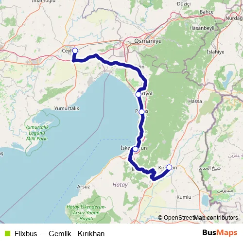 The first stop of the Flixbus bus route is Ceyhan bus station and the last stop is