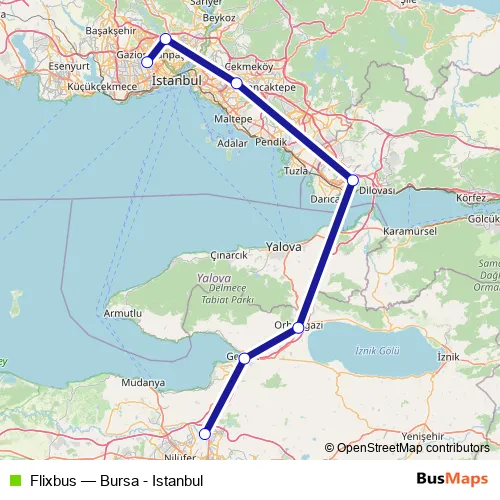 The first stop of the Flixbus bus route is Istanbul, Istanbul Esenler and the last stop is Bursa, Bursa bus station. Flixbus (Bursa - Istanbul) is operational during everyday.