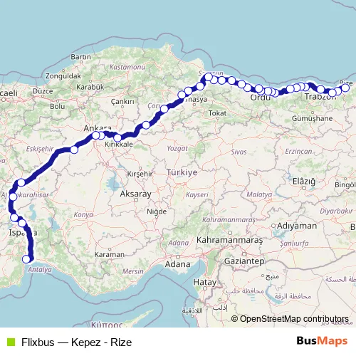 The first stop of the Flixbus bus route is Rize Cumhuriyet Cd and the last stop is Kepez Antalya Terminal District Download Peron. Flixbus (Kepez - Rize) is operational during everyday.