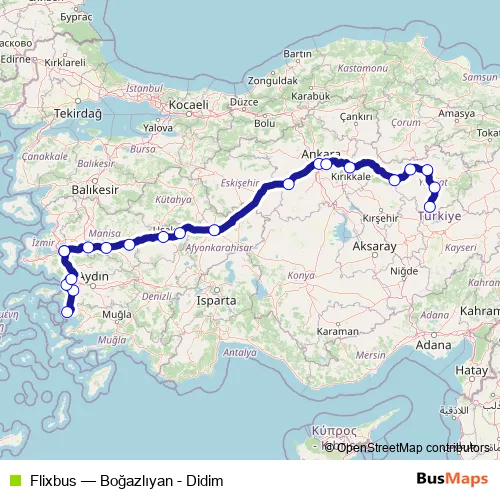 The first stop of the Flixbus bus route is Didim bus station and the last stop is Boğazlıyan Şevket Hokka Ömeroğlu Boulevard. Flixbus (Boğazlıyan - Didim) is operational during everyday.