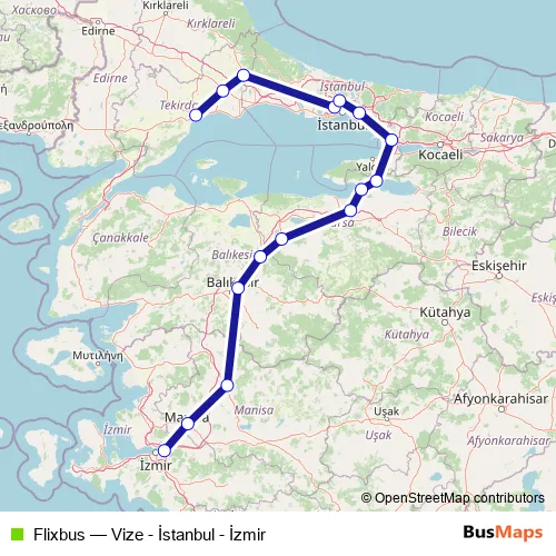 The first stop of the Flixbus bus route is Tekirdağ, Tekirdağ bus station and the last stop is İzmir, Izmir bus station. Flixbus (Vize - İstanbul - İzmir) is operational during everyday.