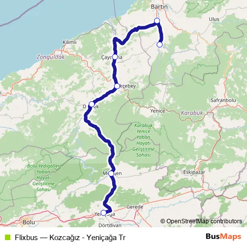 The first stop of the Flixbus bus route is Yenicaga Bus Station and the last stop is Kozcağız Cumhuriyet Cd. Flixbus (Kozcağız - Yeniçağa Tr) is operational during everyday.