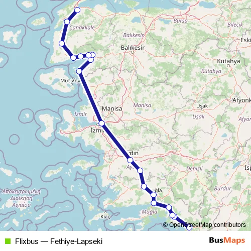 The first stop of the Flixbus bus route is Fethiye, Fethiye bus station and the last stop is Lapseki, Lapseki bus station. Flixbus (Fethiye-Lapseki) is operational during everyday.