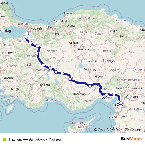 The first stop of the Flixbus bus route is Kırıkhan Bus Terminal between Cities and the last stop is Yalova Municipality Intercity Bus Terminal. Flixbus (Antakya - Yalova) is operational during everyday.