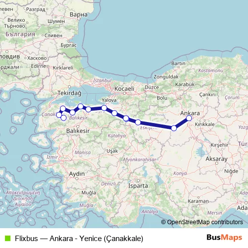 The first stop of the Flixbus bus route is Ankara, Ankara bus station and the last stop is Yenice (Çanakkale). Flixbus (Ankara - Yenice (Çanakkale)) is operational during everyday.