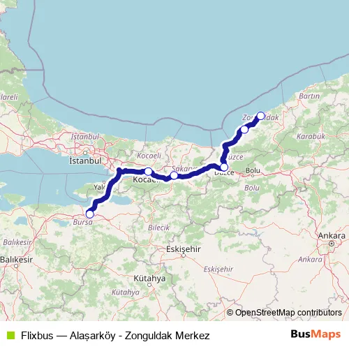 The first stop of the Flixbus bus route is Zonguldak Merkez Veysel Atasoy Caddesi and the last stop is Bursa bus station. Flixbus (Alaşarköy - Zonguldak Merkez) is operational during everyday.