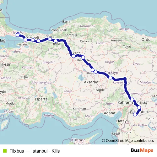The first stop of the Flixbus bus route is Kilis Mercidabik St and the last stop is Istanbul Central Bus Station. Flixbus (Istanbul - Kilis) is operational during everyday.