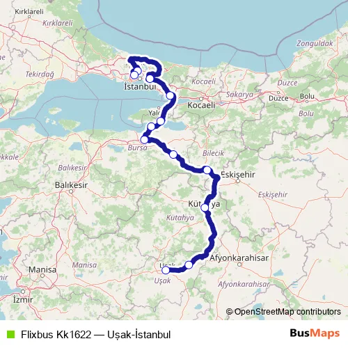 The first stop of the Flixbus Kk1622 bus route is Uşak bus station and the last stop is