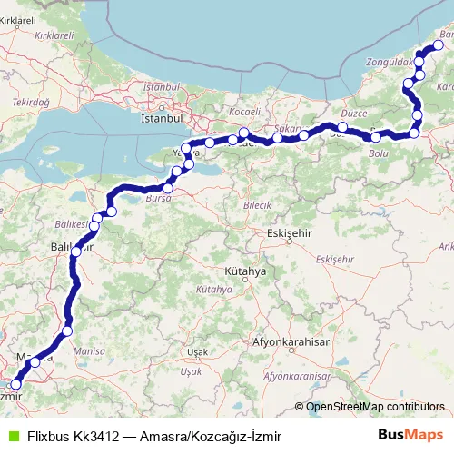 The first stop of the Flixbus Kk3412 bus route is Bartın bus station and the last stop is Izmir bus station. Flixbus Kk3412 (Amasra/Kozcağız-İzmir) is operational during everyday.