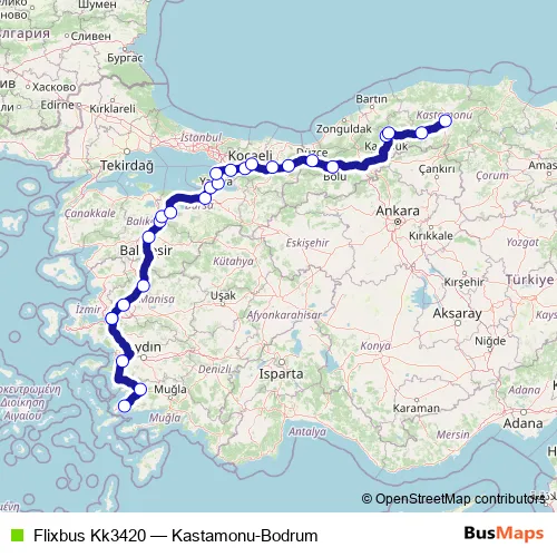 The first stop of the Flixbus Kk3420 bus route is Bodrum bus station and the last stop is