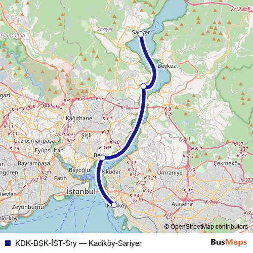 The first stop of the KDK-BŞK-İST-Sry ferry route is Kadıköy-Beşiktaş Şh. and the last stop is Sarıyer Şh.. KDK-BŞK-İST-Sry (Kadiköy-Sariyer) is operational during on weekdays.
