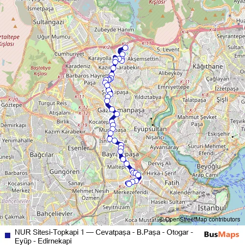 Bus NUR Sitesi-Topkapi 1 - Cevatpaşa - B.Paşa - Otogar - Eyüp - Edirnekapi: Full Schedule in Istanbul