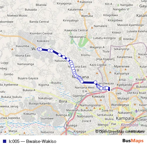 The first stop of the Ic005 bus route is Kobil Petro Station (Wakiso) and the last stop is Bam Supermarket - Bwaise. Ic005 (Bwaise-Wakiso) is operational during everyday.