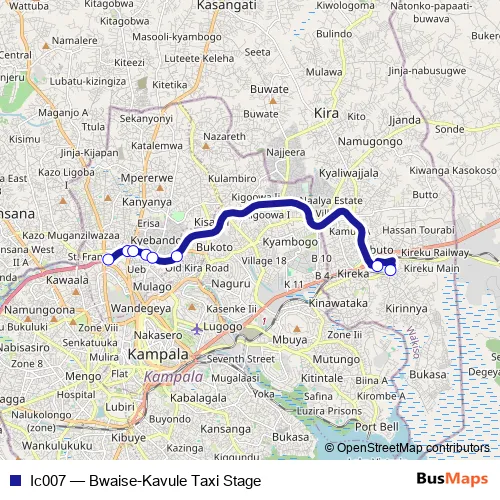 The first stop of the Ic007 bus route is Bwaise Stage - Eastbound and the last stop is Kavule Taxi Stage. Ic007 (Bwaise-Kavule Taxi Stage) is operational during everyday.